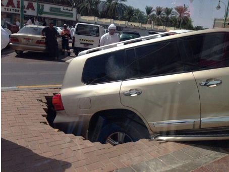 As these pictures will testify, the car, parked on the sidewalk near Al Ain’s busy central market known as the 'gold market' area, sank into the earth as the ground opened up.