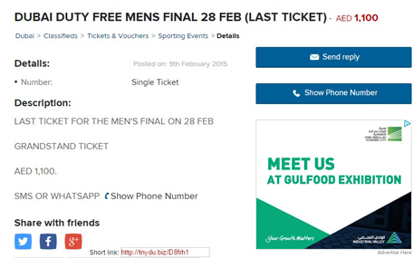 Another advertisement read, “Two men’s final tickets for Dh1,500.” The actual worth is Dh1,200.