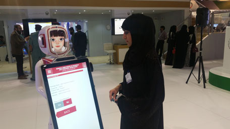“It is real simple: you tab transit visa, enter your details, pay, and an email and SMS confirming the transaction are now sent to you,” an official of the General Directorate of Residency and Foreign Affairs (GDRFA) demonstrated at the ongoing Gitex Technology Week, where the robot is being displayed.
