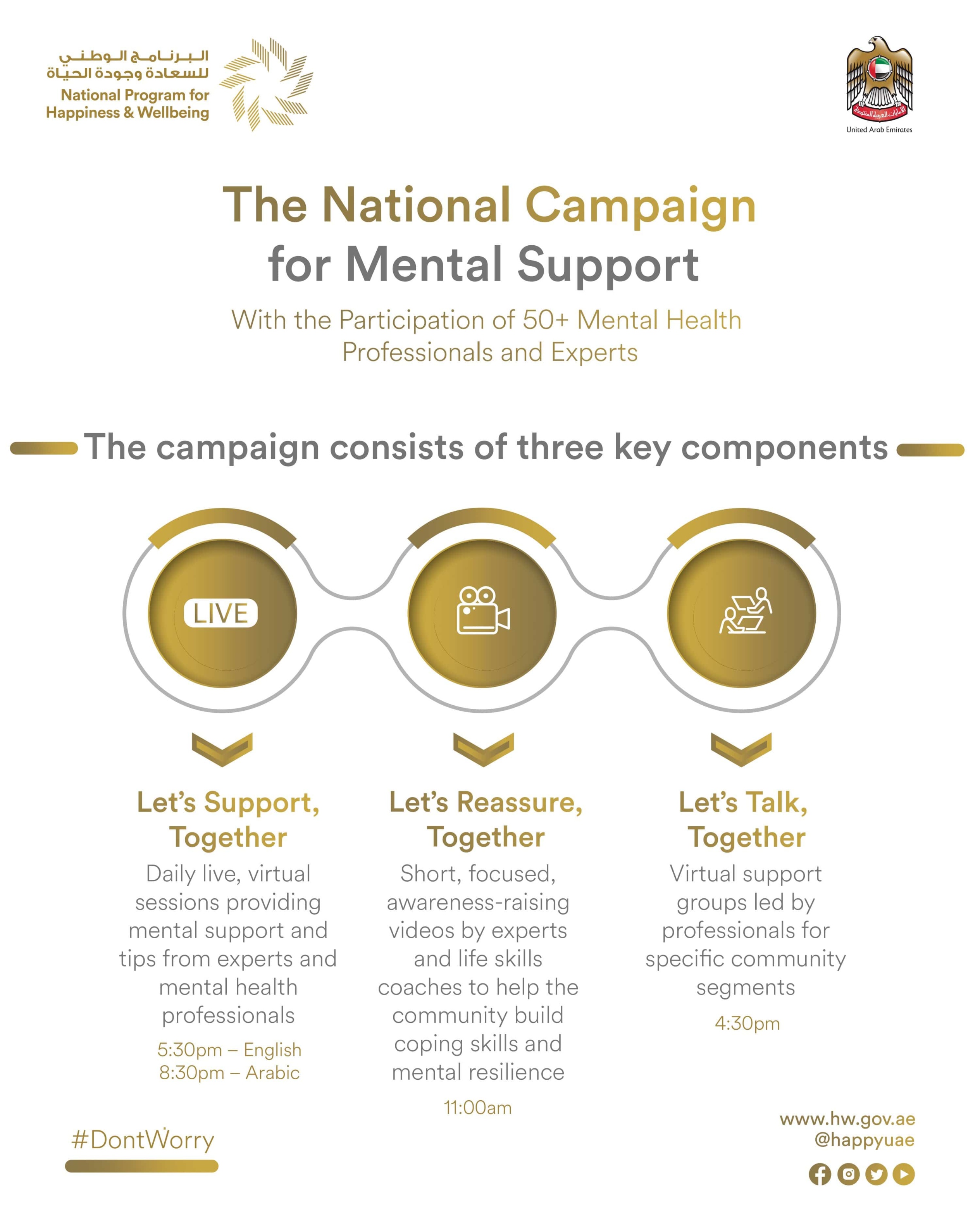 The National Campaign for Mental Support is an online initiative using modern digital solutions and social media channels. It consists of three components, the first: "Let’s Support, Together", features daily online live sessions in which mental health professionals and experts provide mental support, answer questions, and offer the necessary tips and guidance to help people overcome the challenges they face under these special circumstances.