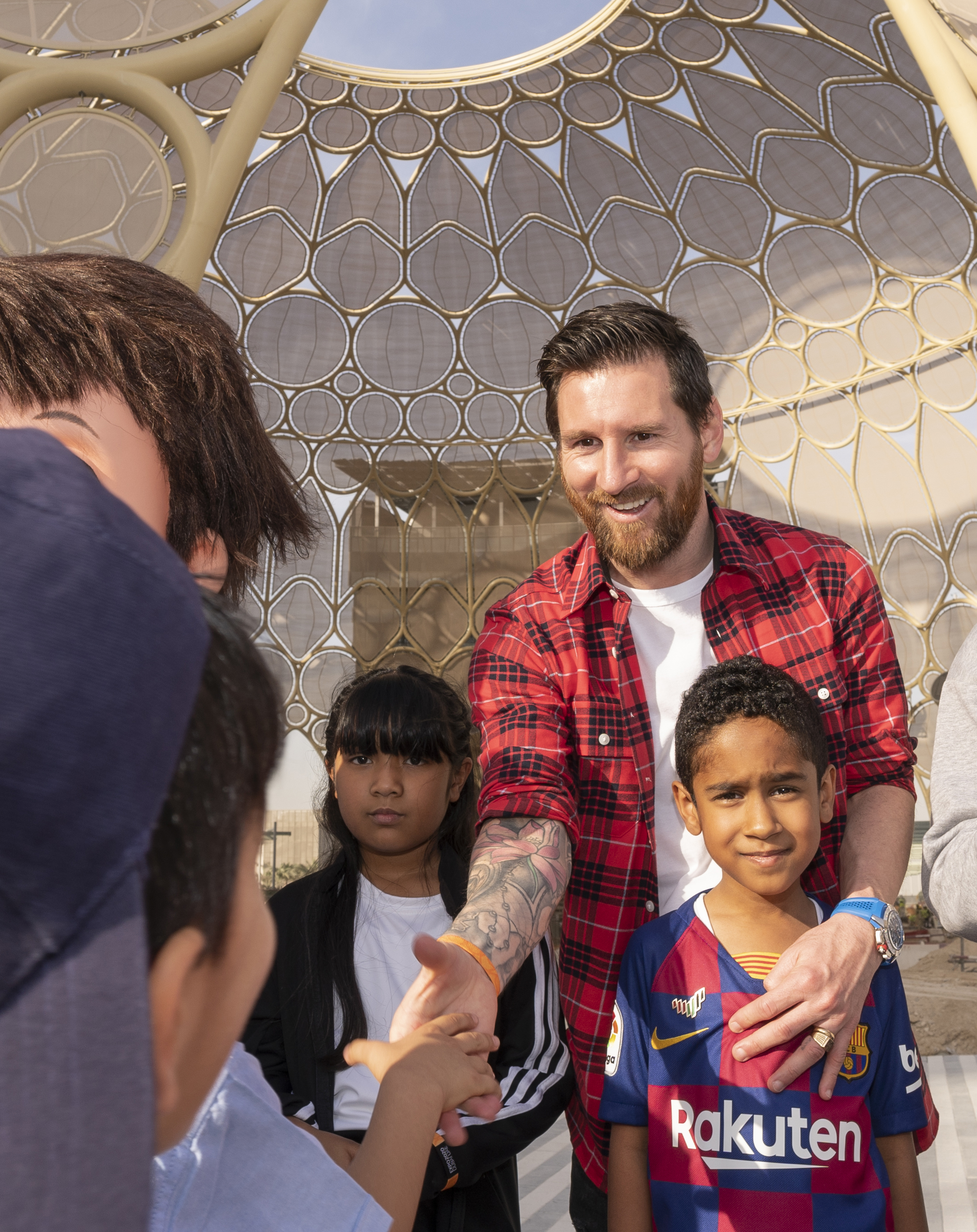 Messi, one of the most-decorated footballers in the history of the game, visited the site of The World’s Greatest Show of human achievement and brilliance to lead the students on a tour of Al Wasl Plaza, take pictures with them and sign souvenirs and memorabilia, including footballs and football boots. He was joined by Expo 2020 mascots Rashid and Latifa.