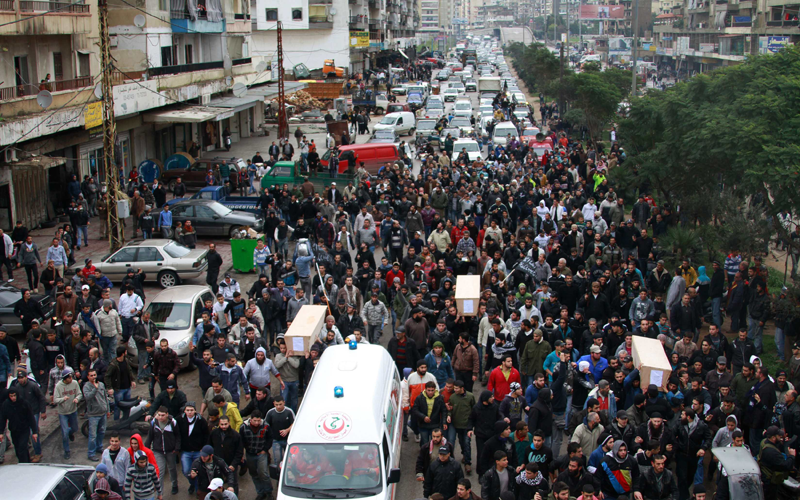A general view of the crowd carrying coffins of Lebanese after their bodies arrived from Syria, in Tripoli, northern Lebanon December 22, 2012. Funerals will be held in Lebanon for three Lebanese fighters killed while fighting with rebels in Syria. (REUTERS)