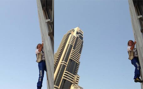 It just took him 65 minutes to climb the 310-metre Cayan Tower in Dubai Marina, the world's tallest tower with a 90-degree twist.