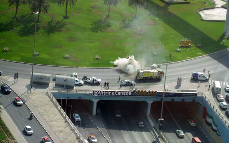 Dubai Police confirmed the same on its official Twitter account at 8.50am: “Fire vehicle accident in Dubai Trade Centre roundabout.”