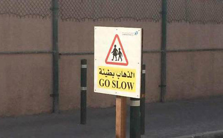 The Arabic language daily Emarat Al Youm carried a picture of the board saying in English “go slow” but the translation in Arabic is wrong, meaning:”slowly is going.”