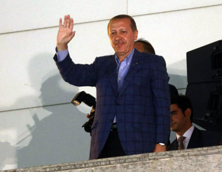 Newly elected Turkish president Recep Tayyip Erdogan waves at supporters from the balcony of the AKP party headquarters during the celebrations of his victory in the presidential election vote in Ankara on August 10, 2014. (AFP)