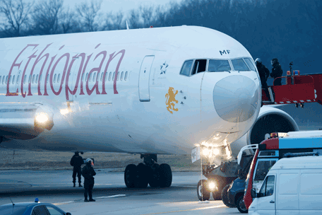 Police evacuate passengers on February 17, 2014 from the Ethiopian Airlines flight en route to Rome, which was hijacked and forced to land in Geneva, where the hijacker has been arrested, police said. There were no immediate reports of injuries and in a statement in Addis Ababa Ethiopian Airlines said "the passengers are safe and sound." The hijacker was the co-pilot, according to the Geneva airport where the plane was forced to land. AFP