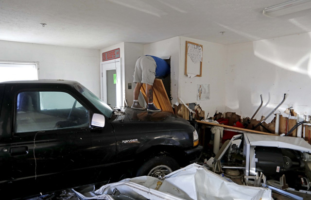 Rudy Martinez squeezes into a closet to turn off the breaker while returning home for the first time since Hurricane Michael hit Mexico Beach. (AP)