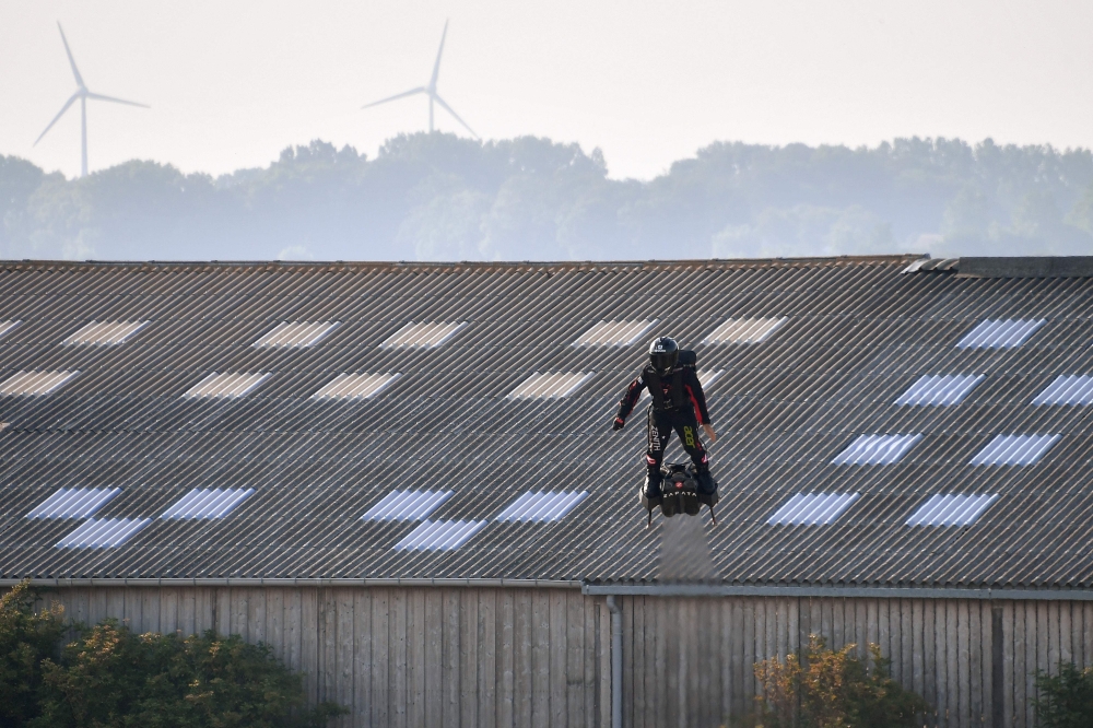 Franky Zapata, 40, a former jet-skiing champion who designed and built his stand-up flying platform, took off from Sangatte on the northern French coast just outside Calais. He plans to land in Britain around Dover after a 20-minute flight.