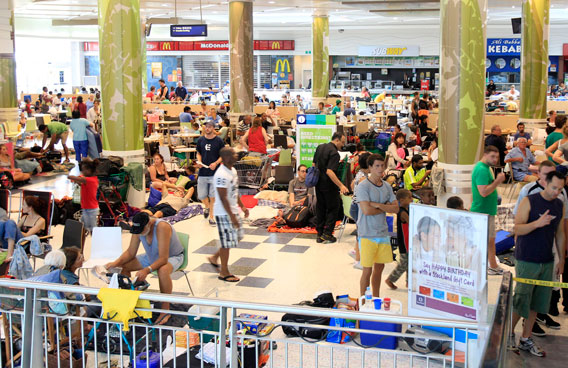 At Cairns airport, people queued from dawn to catch the last flights out before the terminal was locked down and sandbagged against storm surges.