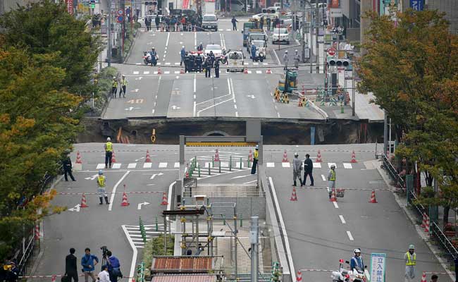 The gaping hole, around 20 metres (66 feet) by 15, exposed support columns of nearby buildings at a traffic intersection in the southern city of Fukuoka, prompting fears of further collapses.