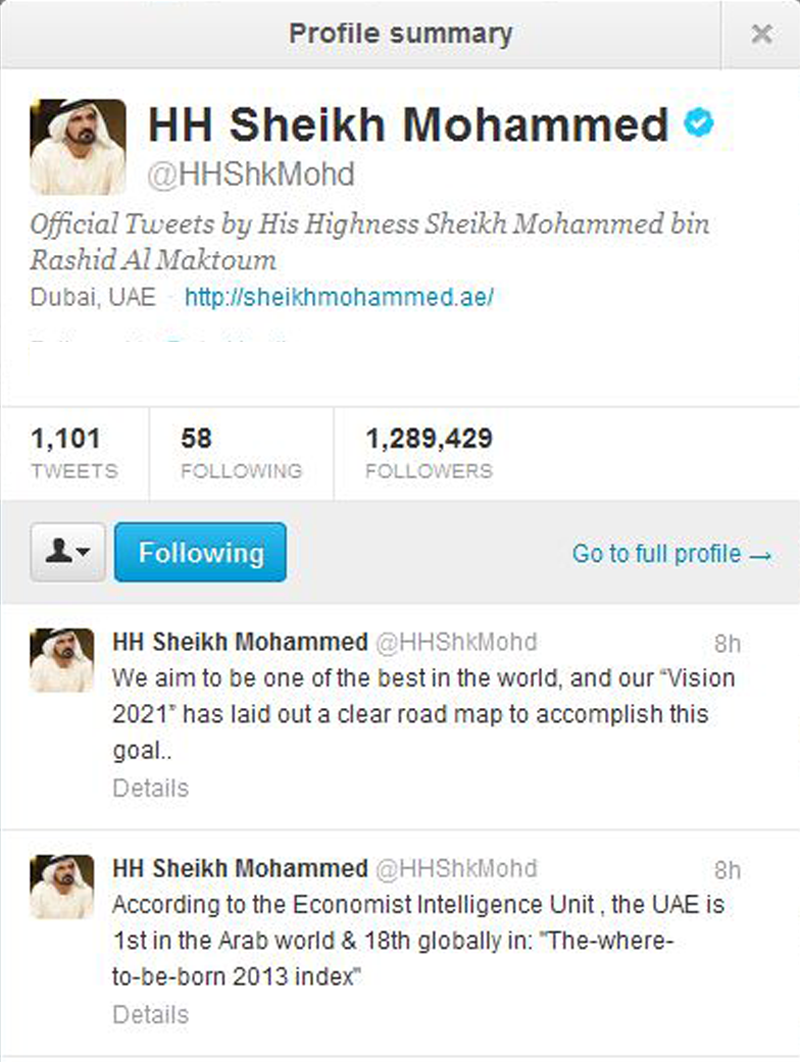 “According to the Economist Intelligence Unit, the UAE is 1st in the Arab World & 18th globally in: ‘The-where-to-be-born 2013 index,’” Sheikh Mohammed tweeted on Monday.