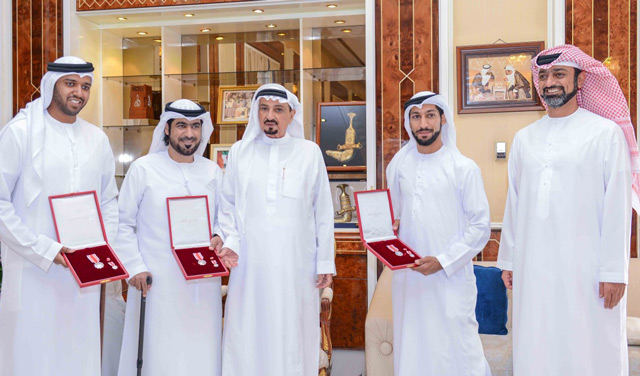 H.H. Sheikh Humaid bin Rashid Al Nuaimi, Supreme Council Member and Ruler of Ajman, has awarded, in the presence of H.H. Sheikh Ammar bin Humaid Al Nuaimi, Crown Prince of Ajman, the "Ajman Bravery Medal" to Rashid Al Dhahouri, Rashid Al Baloushi, Salem Al Wali and Mohammed Al Ghafli, after their return from treatment abroad for injuries sustained while performing their national duty during their tour with the Arab Coalition Forces in Yemen.
