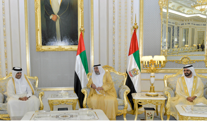 The President His Highness Sheikh Khalifa bin Zayed Al Nahyan received Sheikh Tamim bin Hamad Al Thani, the Emir of Qatar, who is visiting the country as part of a tour of the Gulf Cooperation Council states, at Al Rawda Palace in Al Ain city on Thursday.