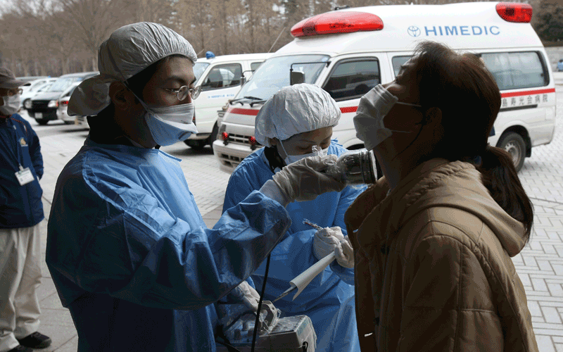 A woman is screened at an evacuation center for radiation exposure leaked from the damaged Fukushima nuclear power plant, in Fukushima, Fukushima Prefecture, Japan. Radiation has seeped into the food supply, with spinach and milk from as far as 75 miles (120 kilometers) showing levels of iodine in excess of safety limits. Minuscule amounts are being found in tap water in Tokyo and rainfall and dust over a wider area. (AP)