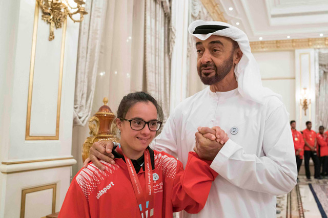 His Highness Sheikh Mohamed bin Zayed Al Nahyan, Crown Prince of Abu Dhabi and Deputy Supreme Commander of the UAE Armed Forces, today received, at the Qasr Al Bahr Majlis, the UAE team of people of determination, who participated in the 9th Special Olympics Regional Games, as well as its administrative and technical bodies, the organising committee of the Games, which was hosted recently by Abu Dhabi, and the UAE Special Olympics Board of Directors.