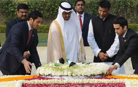 Abu Dhabi's Crown Prince Sheikh Mohamed bin Zayed al-Nahyan (C) during a visit to Raj Ghat, the memorial to the father of the Indian nation Mahatma Gandhi, in New Delhi. (AFP)
