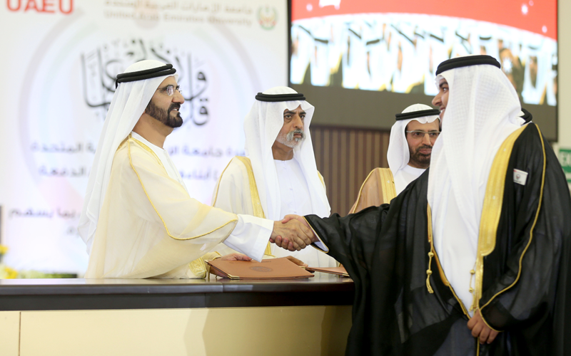Sheikh Mohammed, along with Sheikh Nahyan and Dr. Ali Rashid Al Nuaimi, Vice-Chancellor of UAE University (UAEU), distributed certificates to graduates of the Faculty of Humanities and Social Sciences (FHSS), as well as the Faculties of Science, Administration and Economics, Law, Food and Agriculture and the Colleges of Engineering and Information Technology, and Medicine and Health Sciences (CMHS), who all swore an oath before the Vice President and attendees.