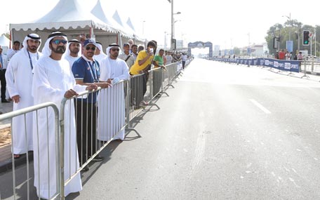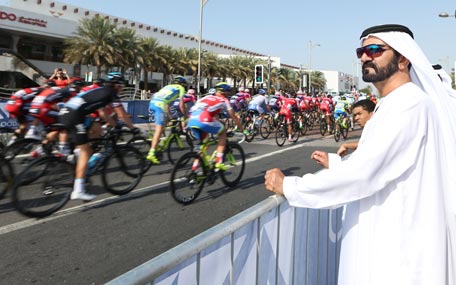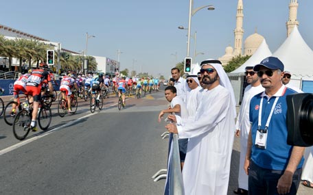 Sheikh Mohammed bin Rashid was accompanied by Khalifa Saeed Sulaiman, Director General of Dubai's Protocol Department, and Saeed Hareb, Chairman of the Organising Committee of Dubai Tour, as he followed the 145km first stage of the race in Jumeirah.