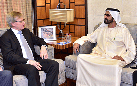 His Highness Sheikh Mohammed bin Rashid Al Maktoum, Vice-President and Prime Minister of UAE and Ruler of Dubai, on Sunday received Professor Carl-Henrik Heldin, Chairman of the Board of the Nobel Foundation, who took part in the opening ceremony of the second edition of the Nobel Museum Exhibition 2016, in Children’s City at Dubai Creek Park.