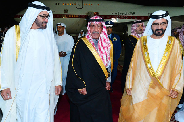 Sheikh Mohammed bin Rashid Al Maktoum and Sheikh Mohamed bin Zayed Al Nahyan are being accompanied by Foreign Minister Sheikh Abdullah bin Zayed Al Nahyan, Dr. Anwar bin Mohammed Gargash, Minister of State for Foreign Affairs, Mohammed Saeed Al Dhaheri, UAE Ambassador to Saudi Arabia and Mohammed Mubarak Al Mazrouei, Under Secretary of the Abu Dhabi Crown Prince's Court.