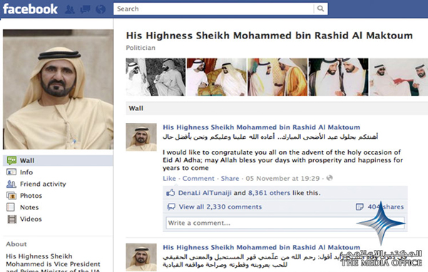 Sheikh Mohammed's Facebook post recorded more than 8,000 "likes" in addition to more than 2,000 comments in both Arabic and English congratulating His Highness on the advent of Eid Al Adha.