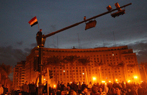 An Egyptian demonstrator sits on top of a set of traffic lights in Tahrir Square in central in Cairo, as thousands took to the streets of Egypt for the sixth consecutive day calling for the resignation of their long term President Hosni Mubarak. (AFP)