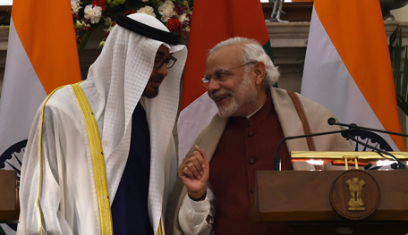 His Highness Sheikh Mohamed bin Zayed Al Nahyan, Crown Prince of Abu Dhabi and Deputy Supreme Commander of the UAE Armed Forces, and Narendra Modi, the Prime Minister of India at Hyderabad House in New Delhi. (AFP)