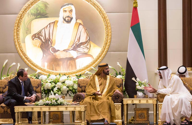 Sheikh Mohammed bin Rashid Al Maktoum and General Sheikh Mohamed bin Zayed Al Nahyan with President Abdul Fattah El Sisi of Egypt, in Abu Dhabi on Sunday. (Wam)
