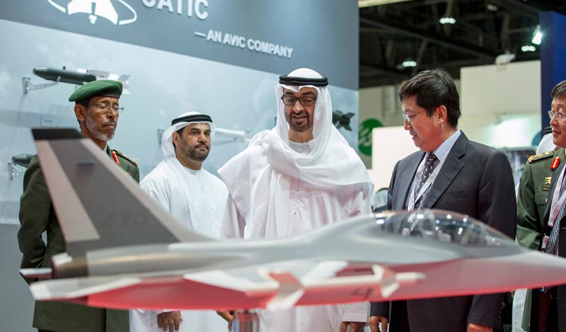 Sheikh Mohamed bin Zayed Al Nahyan visits the CATIC stand at the Chinese pavilion during a tour of the 2015 International Defence Exhibition and Conference (Idex) at the Abu Dhabi National Exhibtion Centre (Adnec) on Thursday. General Hamad Thani Al Romaithi (left), Chief of Staff UAE Armed Forces, is also seen. (Wam)