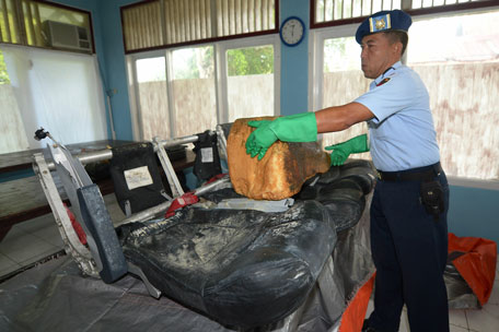 An Indonesian officer holds newly recovered wreckage from Air Asia flight QZ8501 found during search operations in the Java sea, in Pangkalan Bun on January 6, 2015. (Reuters)