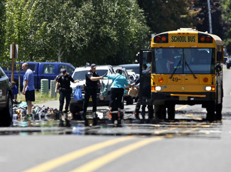 Police transfer student backpacks into a school bus after a shooting at Reynolds High School in Troutdale, Oregon June 10, 2014. A gunman walked into the Oregon high school with a rifle and shot a student to death on Tuesday before he was later found dead, in the third outbreak of gun violence to shake a U.S. high school or college campus in less than three weeks. The student backpacks were being transferred into the bus so that the students could pick them up later at a different location. (REUTERS)
