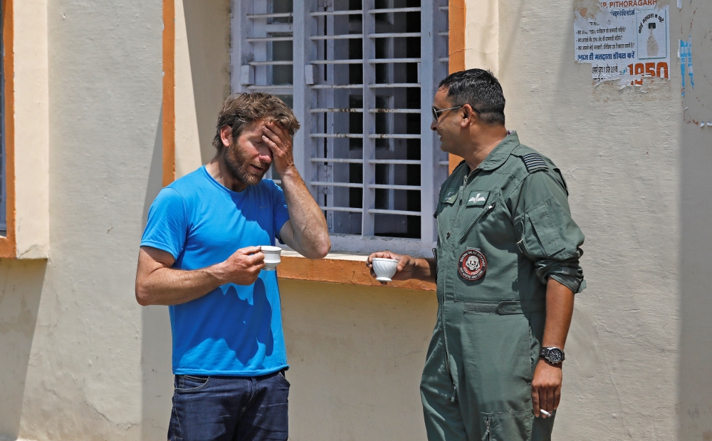 British Climber and expedition’s deputy leader, Mark Thomas reacts as he talks to an Indian Air Force pilot in Pithoragarh town, in the Himalayan state of Uttarakhand, India. (Reuters)