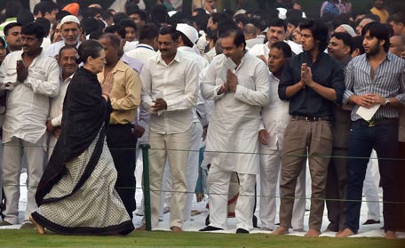 Sonia, dressed in a sombre black-and-grey sari, was accompanied by her son, Rahul, 44, heir to the Congress dynasty, which dominated India's post-independence politics.
