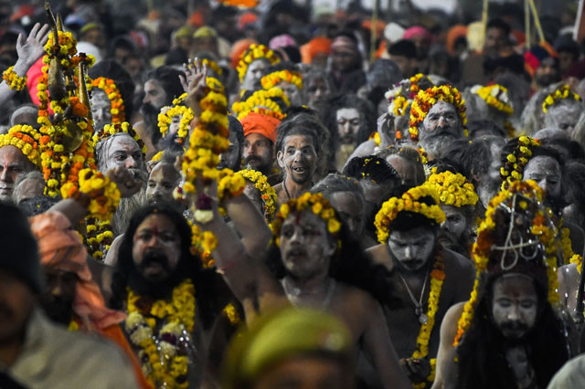 The first to bathe were the naga and sadhus, whose bodies were covered with ash.