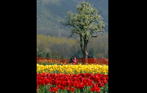 A couple rests on a bench inside Kashmir's tulip garden during Baisakhi festival in Srinagar. (REUTERS)