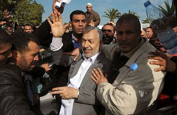 Rached Ghannouchi (C), the leader of Tunisia's Islamist movement Ennahdha, waves upon arrival at the Tunis-Carthage airport in Tunis. Ghannouchi told AFP Sunday his movement wanted to play a political role in Tunisia, upon returning to his homeland from more than 20 years in exile after the fall of the old regime. (AFP)
