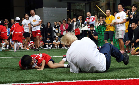 London Mayor Boris Johnson (R) and an elementary school boy collide as they play rugby in Tokyo on October 15, 2015 during a promotional event for the 2019 Rugby World Cup which will be held in Japan. (AFP)