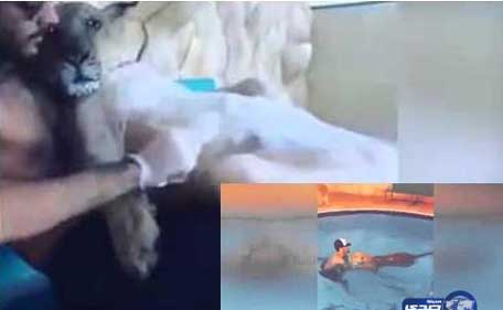 The film later showed the two in the swimming pool and the man demonstrated more affection when the lion dived towards him and they hugged each other.