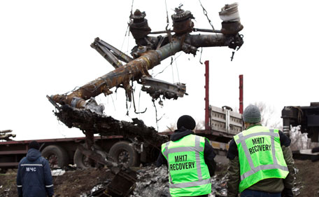 Members of the Dutch export team watch as parts of the wreckage of the Malaysia Airlines Flight MH17 are removed and loaded on a truck at the crash site near the village of Grabove in eastern Ukraine, on November 16 2014. Work began to remove the wreckage of Malaysia Airlines flight MH17 from rebel-held territory in eastern Ukraine, four months after it was shot down claiming 298 lives. (AFP)