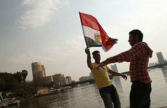 Egyptian youths wave a national flag as they dance on a boat in the Nile River in Cairo. Egypt's military government on Monday urged a halt to widespread strikes inspired by a popular uprising that threatened to paralyse the country following Hosni Mubarak's overthrow. (AFP)