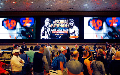 A screen shows an advertisement for a fight between Floyd Mayweather Jr. and Manny Pacquiao as people wait to check in at the MGM Grand on Friday, April 24, 2015, in Las Vegas. The fight is scheduled to take place May 2 at the hotel and casino. (AP)