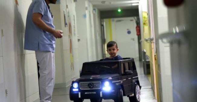 A two-year-old happily drives his way to the operating room at a hospital in Valenciennes in northern France. (AFP)