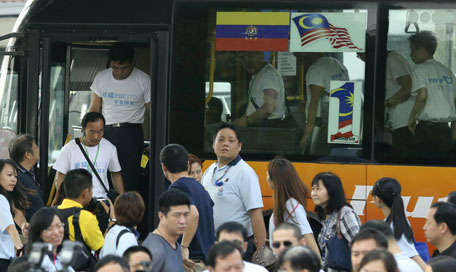 Chinese relatives of passengers on board the missing Malaysia Airlines Flight 370 exit from a bus as they arrive to pray at a Buddhist temple in Petaling Jaya, Malaysia, Monday, March 31, 2014. Relatives from China are in the country to seek answers as to what happened to their loved ones on board the Malaysian jet that vanished more than three weeks ago. The writing on the shirts reads "Praying that MH370 returns home safely." (AP)