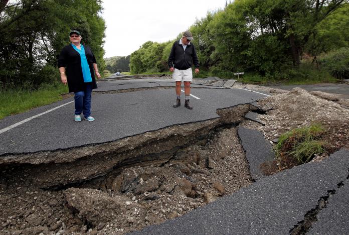 Local residents Chris and Viv Young look at damage caused by an earthquake along State Highway One, south of the township of Blenheim on New Zealand's South Island. (Reuters)