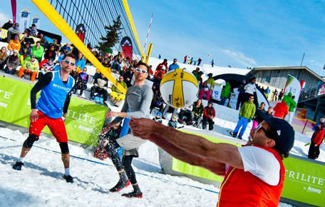 Think of it as beach volleyball at 6,500 feet (2,000 metres), played on white powder with skiers whizzing by.