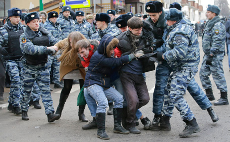 Police detain protesters outside a courthouse in Moscow February 21, 2014. Police detained about 200 people on Friday outside a Moscow courthouse where eight people were convicted of rioting and assaulting police at a protest against President Vladimir Putin in 2012, a police spokesman said. (REUTERS)