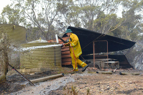 A Country Fire Service volunteer puts out spot fires next to a burnt out shed near One Tree Hill in the Adelaide Hills, northeast of Adelaide on January 3, 2015. Houses were lost as an intense bushfire raged out of control in South Australia on on January 3, as authorities warned the state faced its worst wildfire danger since deadly 1983 blazes. (AFP)