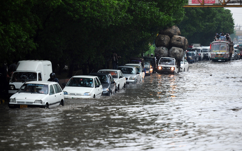 Pakistani motorists drive along a flooded street in Peshawar on August 3, 2013. At least 15 people have been killed and 30 others injured in flash floods triggered by heavy rains in Pakistan, even as authorities warned the situation may worsen further. (AFP)