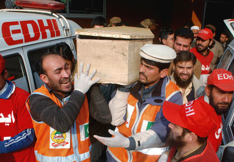 Rescue workers and family members carry the coffin of a student, who killed during an attack by Taliban gunmen on the Army Public School, in Peshawar, December 16, 2014. (AP)